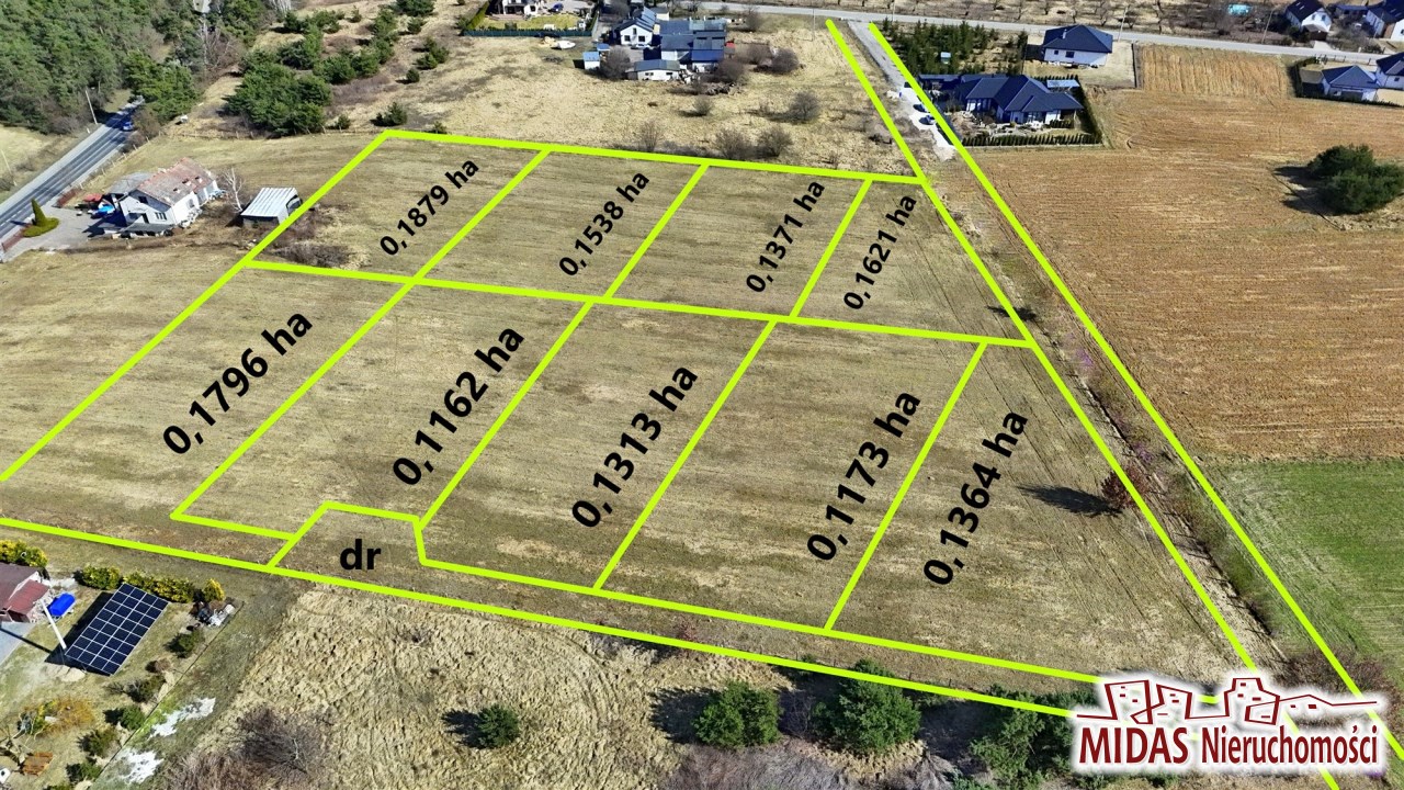 Działki o powierzchni od 1162 m2 do 1879 m2 w cenie 105 zł/m2. Woda i prąd obok działek.